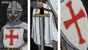 Technique: Tapestry shading and split stitch on canvas with gold leaf and acrylic paint.