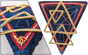 I was inspired by the harlequin pattern of repeating diamonds, and the Baroque–style decoration on Venetian masks. Unlike the diamonds design to attract attention with brilliant sparkle, these are ones a girl can hide behind, should the need arise. Silk shading and metal thread.