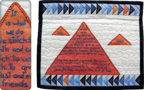 Artist’s statement: "John Jacob Bausch believed all people had a right to good vision. Therefore, he travelled around the state where he lived to provide an opportunity for vision testing to the wider community. John was away from home for months at a time & his wife, Anna, missed him dearly. To fill the lonely days, she stitched the eye charts he used daily, & thought of him with every loving stitch.
