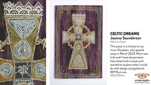 Artist’s statement: I used mixed media to enhance the facial shading. To portray the perceptions of vision radiating from the 3rd eye the use of single thread and minimal colours enabled me to demonstrated forcefulness and keep the work delicate. It was challenging and immensely enjoyable with many frustrating moments.